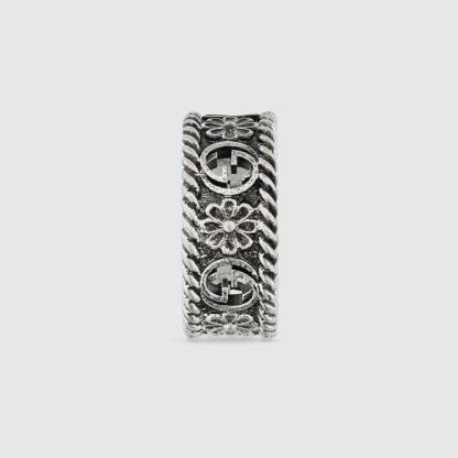 インターロッキングGのカットアウトモチーフとフラワーのエングレービングが交互に配された、スターリングシルバーのリング。テクスチャード トーション トリムで仕上げられています。創設者グッチオ・グッチへのオマージュであり、グッチを象徴するインターロッキングGのモチーフを、遊び心のある解釈でプレシャスなアクセントと合わせたアイテムです。