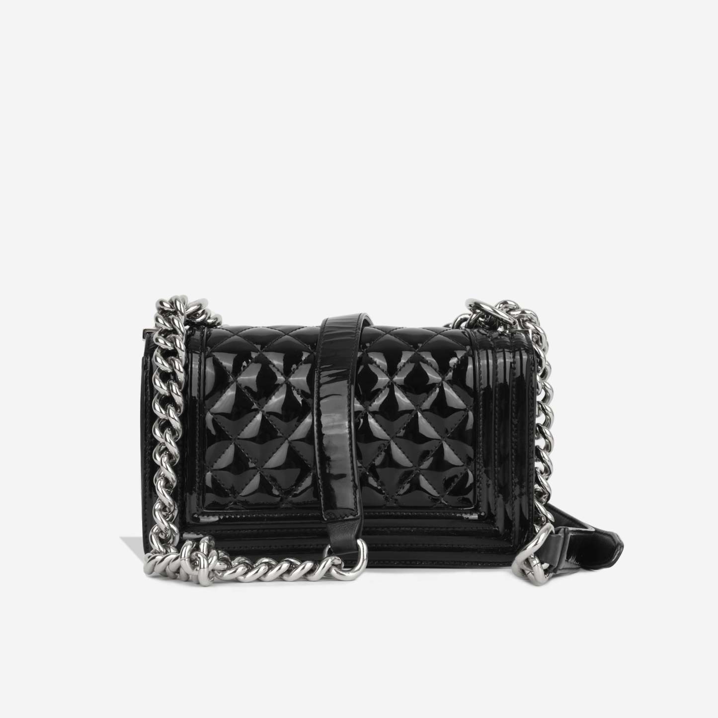 The 'Boy' bag. first introduced in 2011 and named after Coco Chanel's lifetime love. is part of their iconic collection. This particular edition is created usingblack patent leather and can be worn with the chaindoubled up over the shoulder for an evening look or wear cross body for a more casual style.