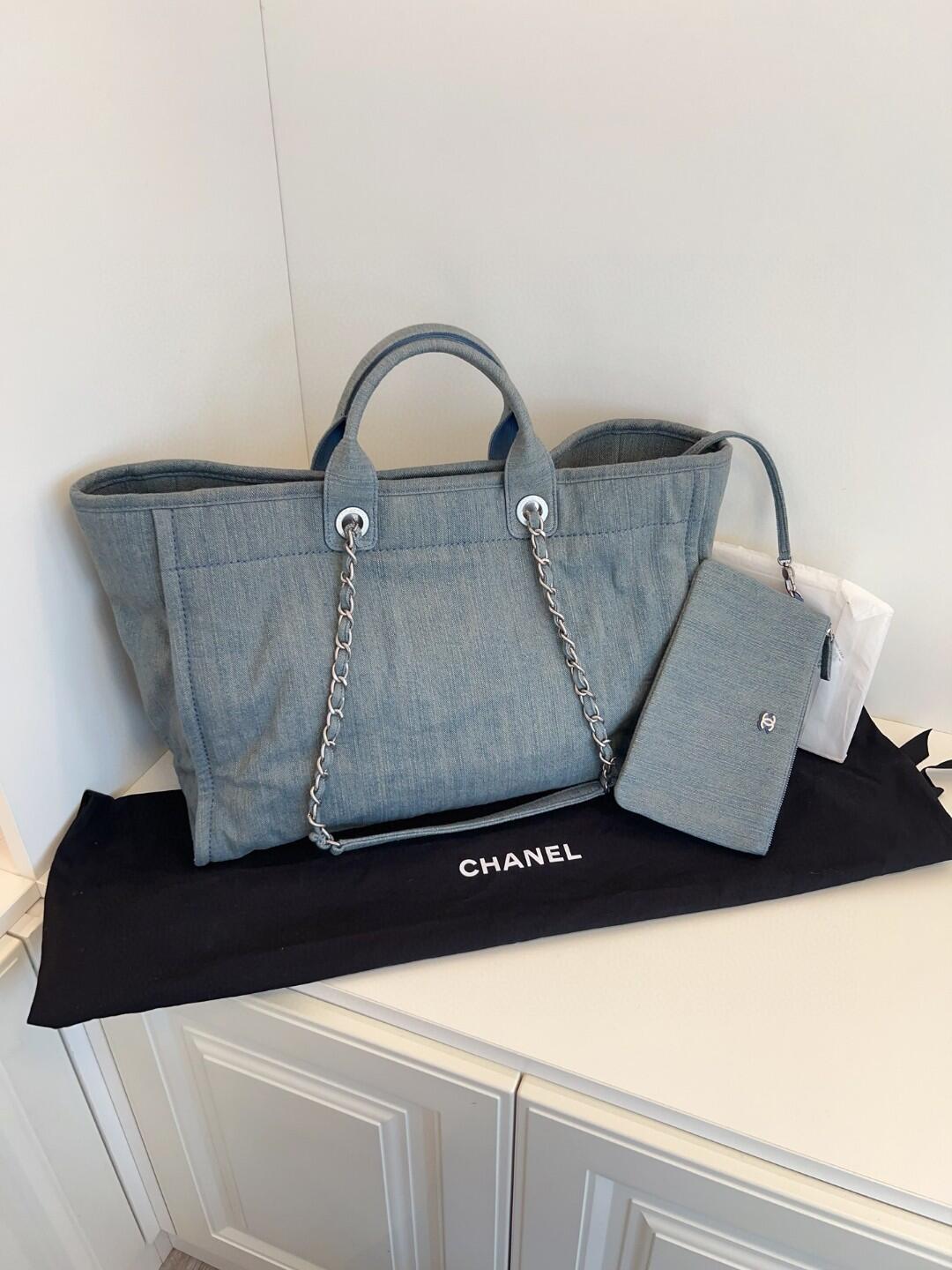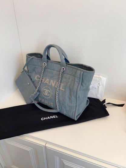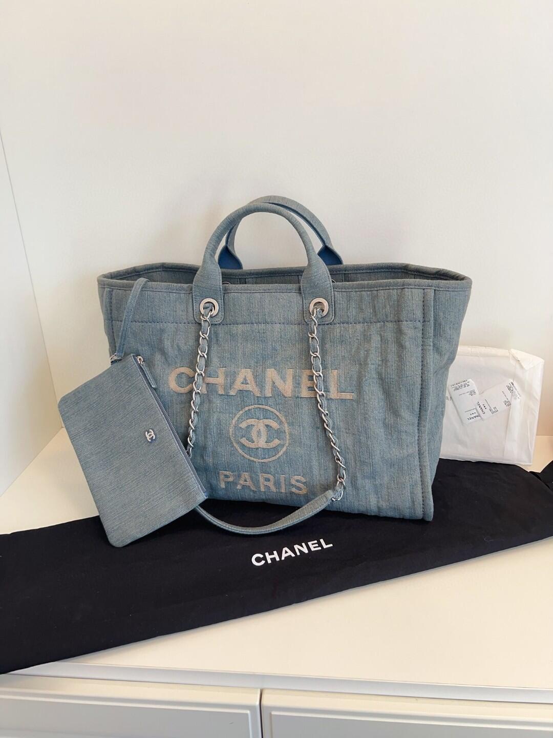 2023年春夏コレクションより登場した、CHANELの「23S」ミディアムサイズのショッピングバッグ。爽やかなライトブルーのウォッシュドデニムにホワイトのブランドロゴ刺繍が施され、季節感と高級感を兼ね備えた洗練されたデザイン。デイリーユースはもちろん、リゾートや週末のお出かけにも最適なバッグです。内部には収納力に優れたポケットも備え、機能性とスタイルを両立。軽量で持ちやすく、長時間の使用でも快適です。
