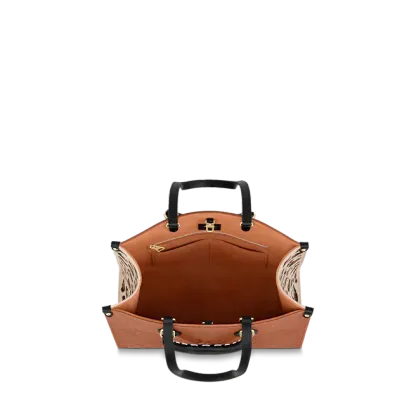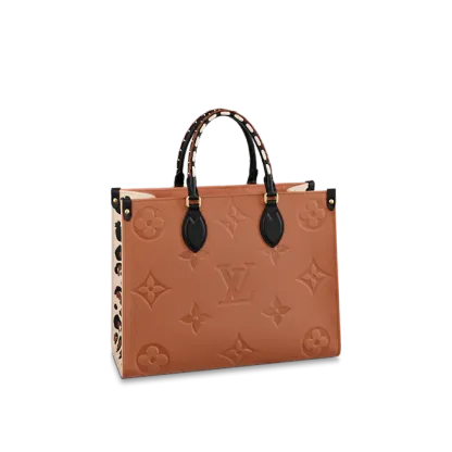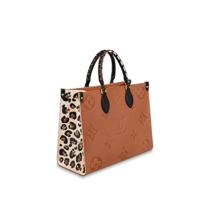 2021年の「ワイルド・アット・ハート」カプセル・コレクションに登場した「オンザゴー MM」。艶やかなモノグラム・パターンのエンボス加工が特徴のモノグラム・アンプラント レザーで仕立て、サイドにはレオパード・プリントをあしらいました。編み上げレザー製のトップハンドルと長めのレザーストラップで、さまざまな持ち方をお楽しみいただけます。その名の通り、女性の必需品をしっかり収納できるアイテムです。
