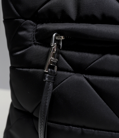 プラダを象徴するトライアングルを象徴的に再解釈した幾何学モチーフが特徴のパッド入りトートバッグ。海から回収されたプラスチック素材を再利用、浄化した再生糸、Re-Nylonを使用しています。ナッパレザー(羊革)のハンドルと取り外し可能なファブリックのショルダーストラップを備えた、正面のアイコニックなエナメルトライアングルが特徴的なアイテム。