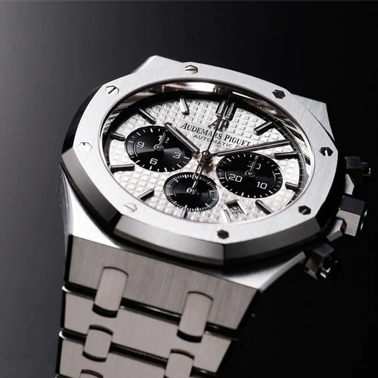 「グランドタペストリー」模様のシルバーダイヤル、ブラックのカウンターとインナーベゼル、ホワイトゴールド製アプライドアワーマーカーと蓄光処理を施したロイヤルオーク針。