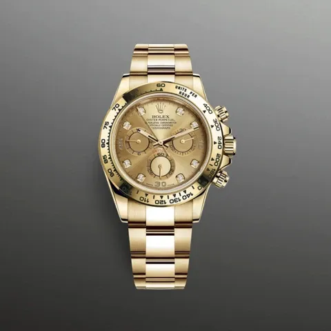 18 ct イエローゴールドのオイスター パーペチュアル コスモグラフ デイトナは、シャンパンカラー、ダイヤモンド入りダイアルとオイスターブレスレットを備え、18 ct イエローゴールドタキメーターベゼルが特徴的である。