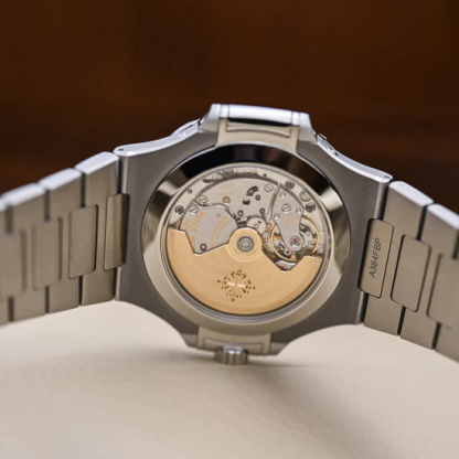 ウォッチ自動巻ムーブメント。 キャリバー 324 S QA LU 24H/303。 曜日、日付、月を窓表示。 ムーンフェイズ。 24時間表示。 センターセコンド。文字盤ブルー、ブラックグラデーション、夜光付ゴールド植字インデックス。ケースステンレススチール仕様。 ねじ込み式リュウズ。 サファイヤクリスタルバック。 12気圧防水。 ケース径(10-4時方向):40.5 mm。 厚さ:11.3 mm。バンドステンレススチール。 ノーチラス折り畳み式バックル。